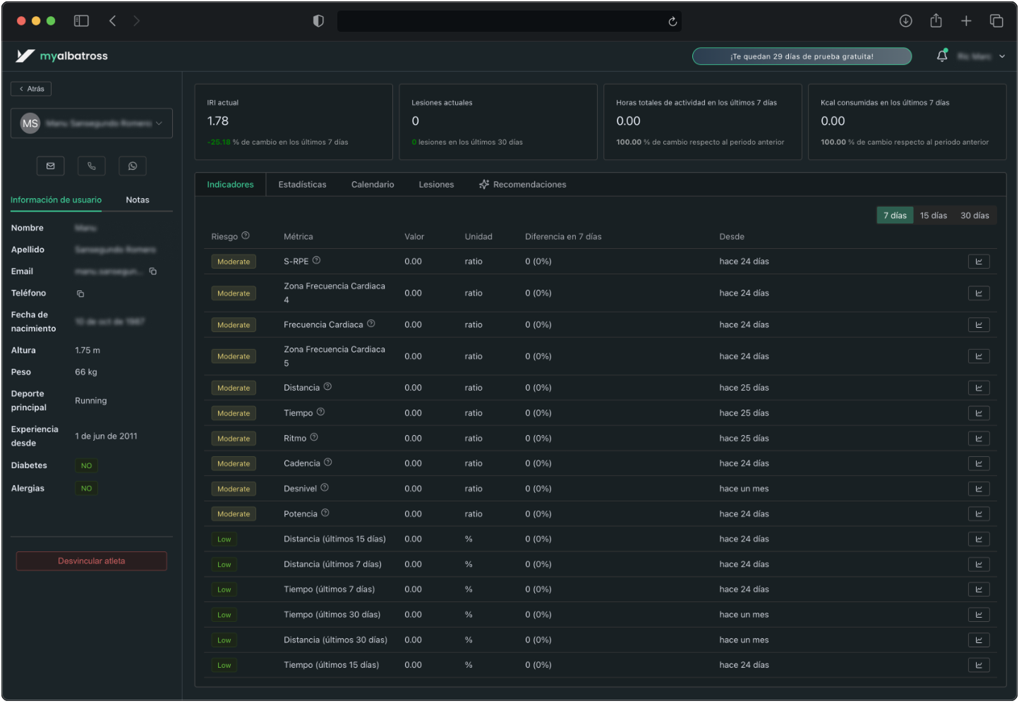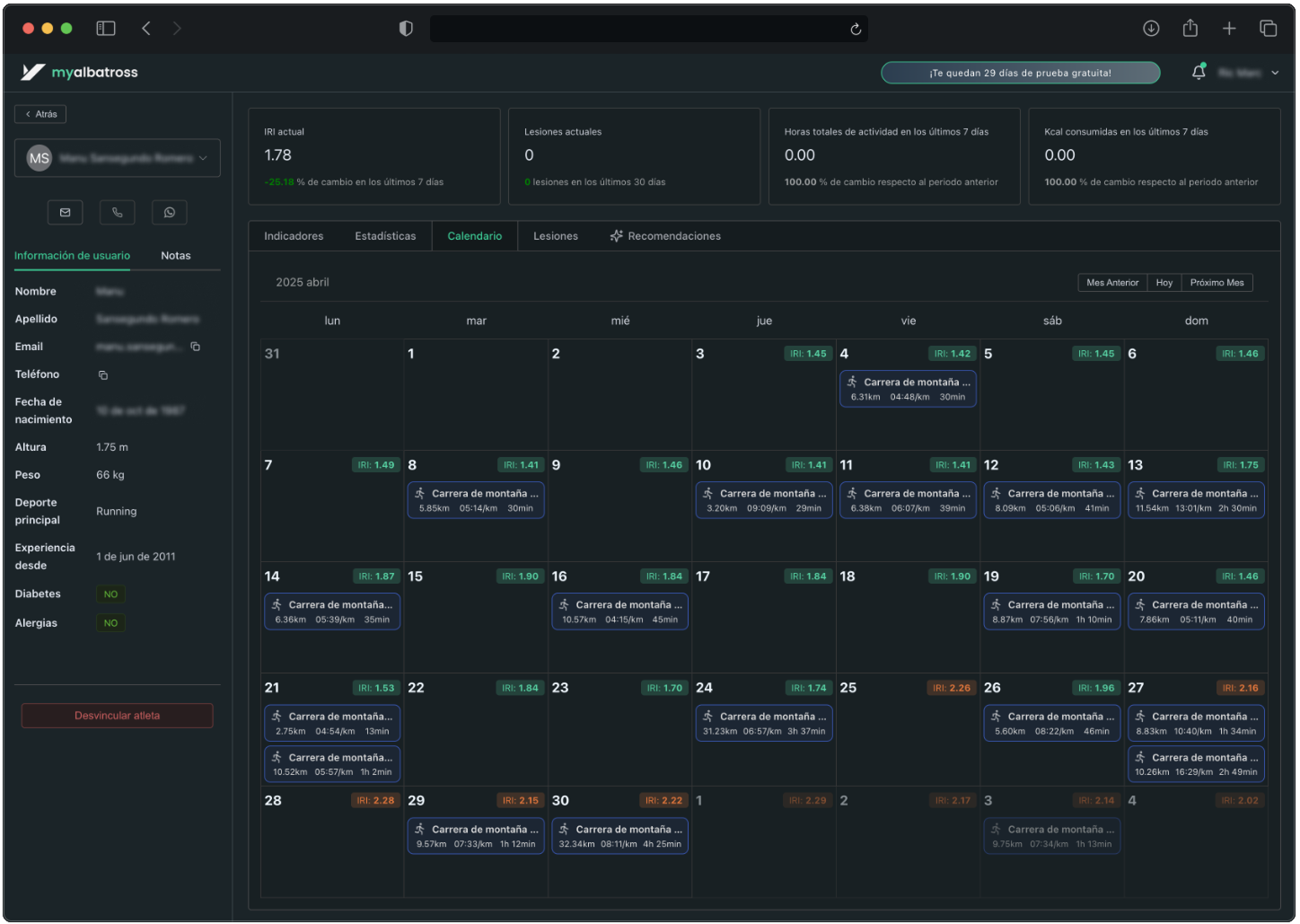 Your athletes will have a simple app to view their workouts, communicate with you, check their Injury Risk Indicator (IRI) and key indicators, receive your recommendations, and record relevant data. They will also be able to report injuries, discomfort, and their progress.